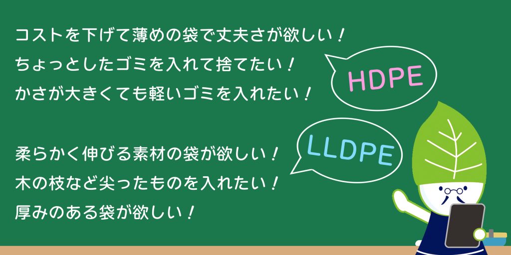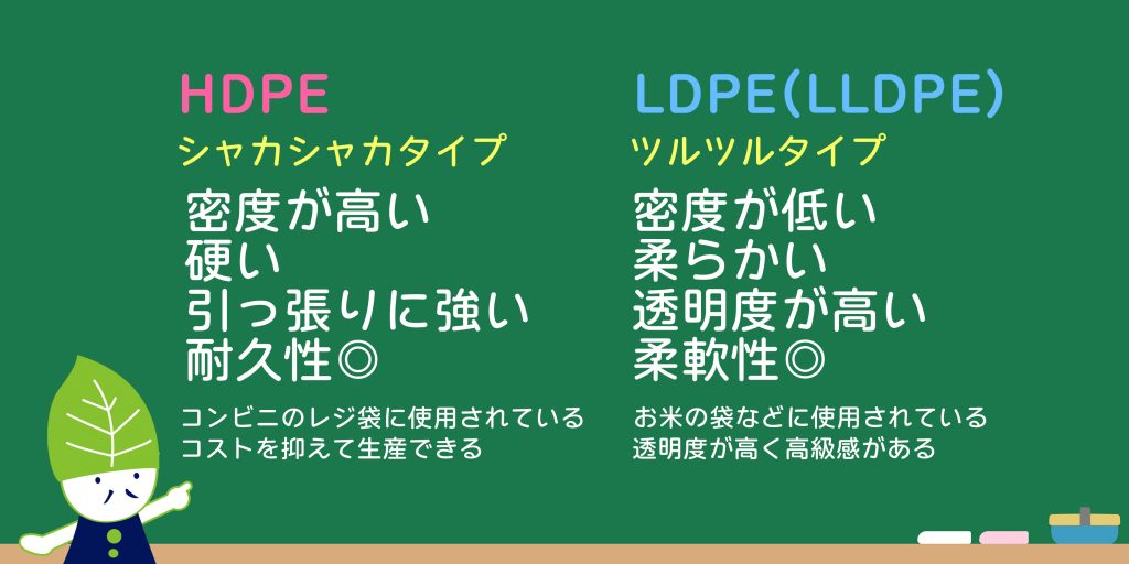 薄い袋はHDPEが多く、厚めの袋はLDPEが多いのはその特徴を生かしてあるからです。